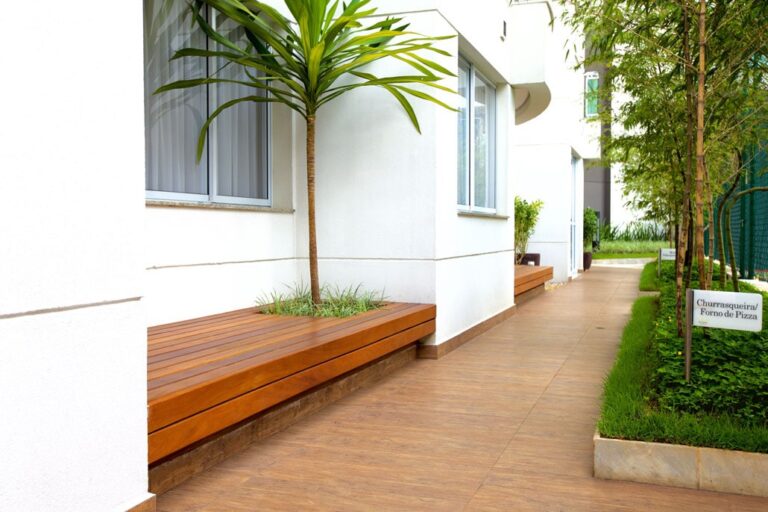 No jardim, o revestimento de madeira pode ser aplicado no chão formando um caminho por onde as pessoas podem pisar até um banco, por exemplo, sem prejudicar a grama.
